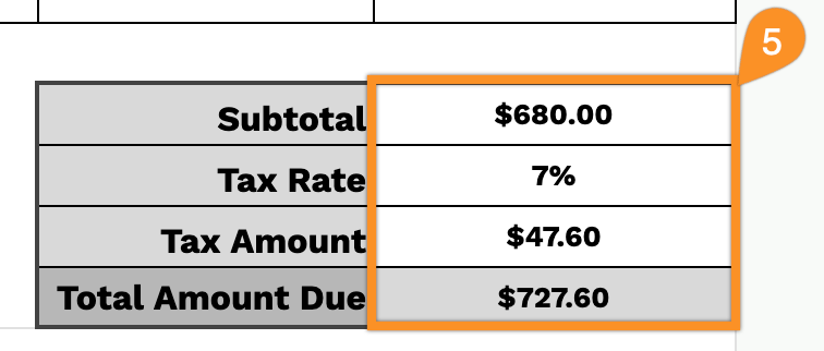 5. If any tax applies, enter the tax rate. The template will calculate the subtotal, tax amount, and total payment due.