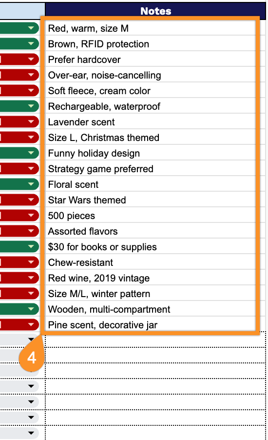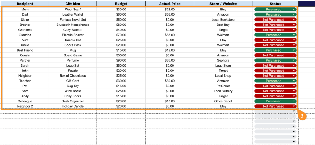 - Progress status monitoring: Track each gift from initial idea to final purchase with the Status column, allowing you to see at a glance which items still need attention, which are on order, and which purchases are complete as you work through your list.