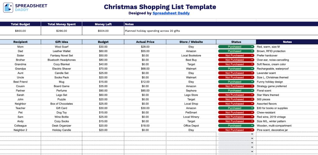 Christmas shopping requires keeping track of multiple details: who you need to buy for, what gifts to purchase, and how much you’re spending. Without a system in place, it’s easy to lose track of your progress or overlook someone on your list.
