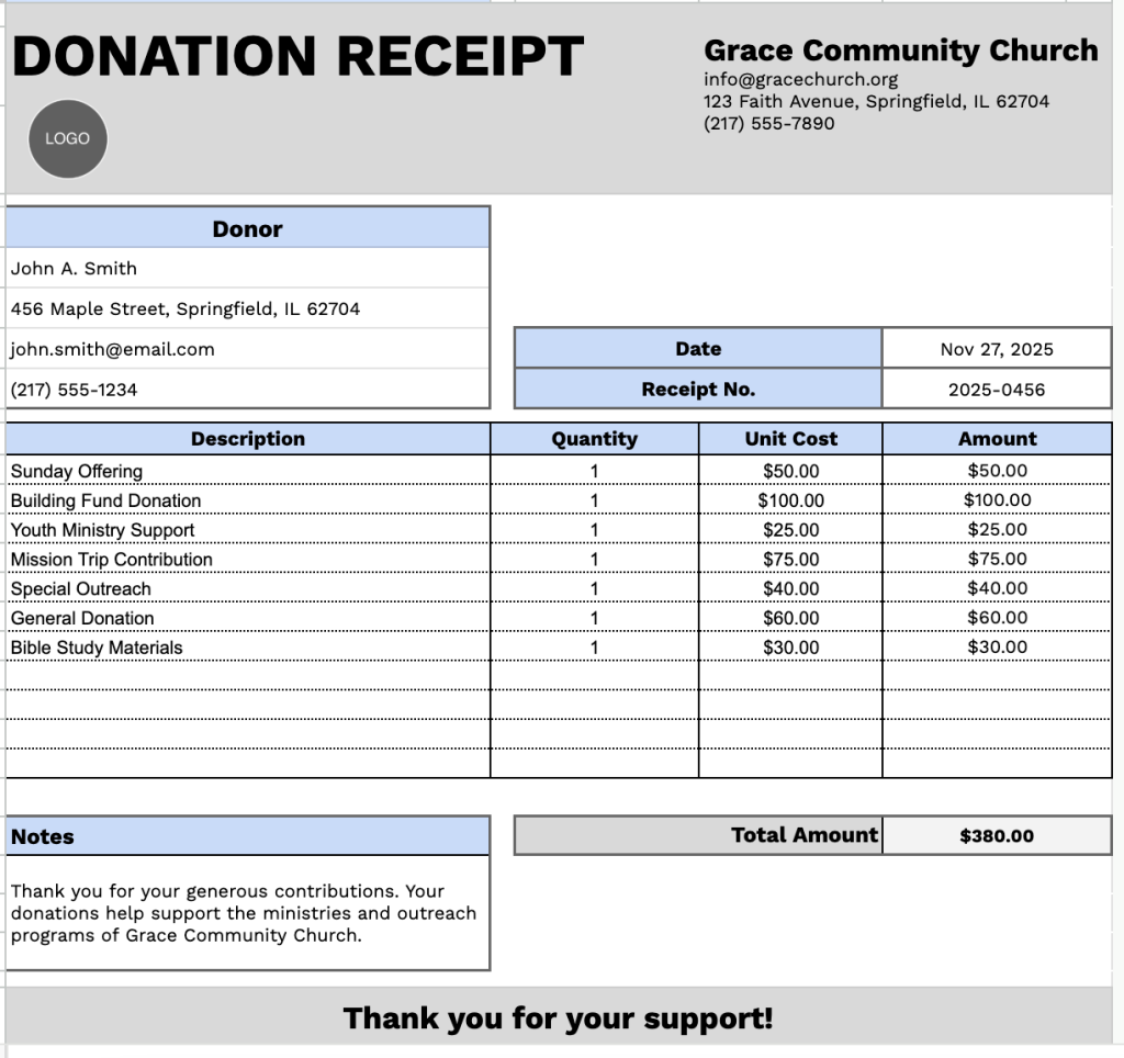 These templates help churches maintain organized financial records while ensuring donors receive the documentation they need to file their taxes.