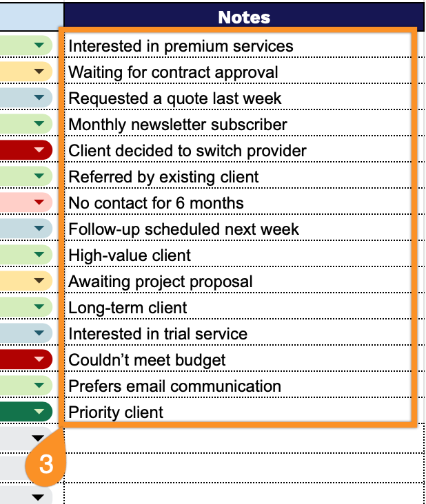 - Flexible notes section: A dedicated Notes column provides space to record critical client-specific details such as preferences, special requirements, key dates, communication history, or any contextual information that enhances client relationship management.