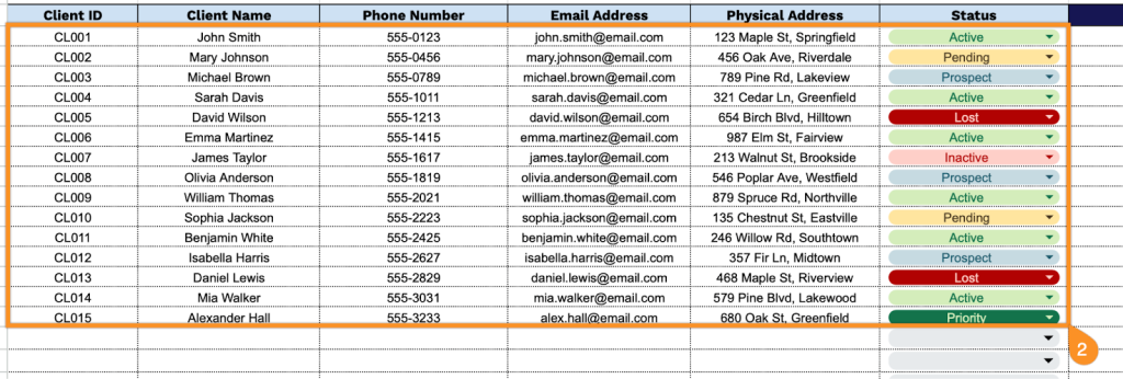 - Complete contact information fields: Dedicated columns for Phone Number, Email Address, and Physical Address ensure you have all necessary communication channels readily available for client outreach, correspondence, and service delivery.