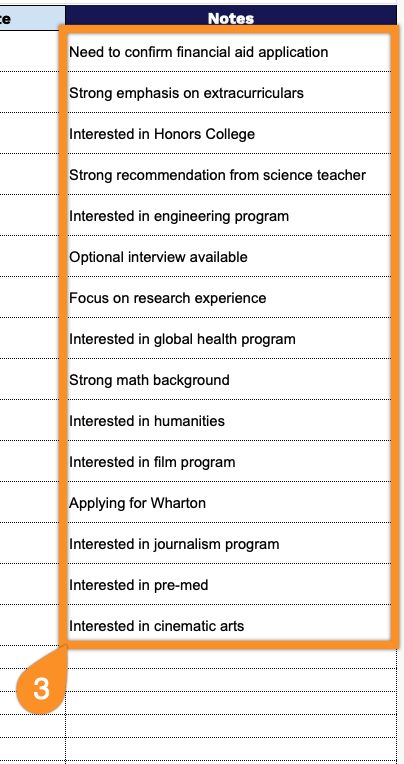 - Customizable notes and document tracking: The Required Documents field allows you to list specific materials needed for each school (transcripts, essays, recommendations, test scores), while the Notes column provides space for additional details such as scholarship opportunities, campus visit impressions, or special program requirements unique to each institution.