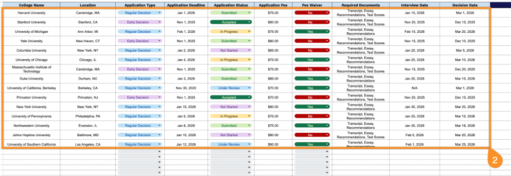 - Comprehensive application tracking columns: The template features essential tracking fields, including College Name, Location, Application Type, Application Deadline, Application Status, Application Fee, Fee Waiver, Required Documents, Interview Date, Decision Date, and Notes, providing a complete overview of every aspect of your college application process in one centralized spreadsheet.