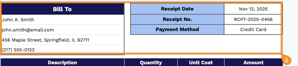 - Comprehensive student and transaction details: Dedicated input fields capture essential information, including student name, email, address, phone number, receipt date, receipt number, and payment method, ensuring accurate record-keeping for every tuition payment.