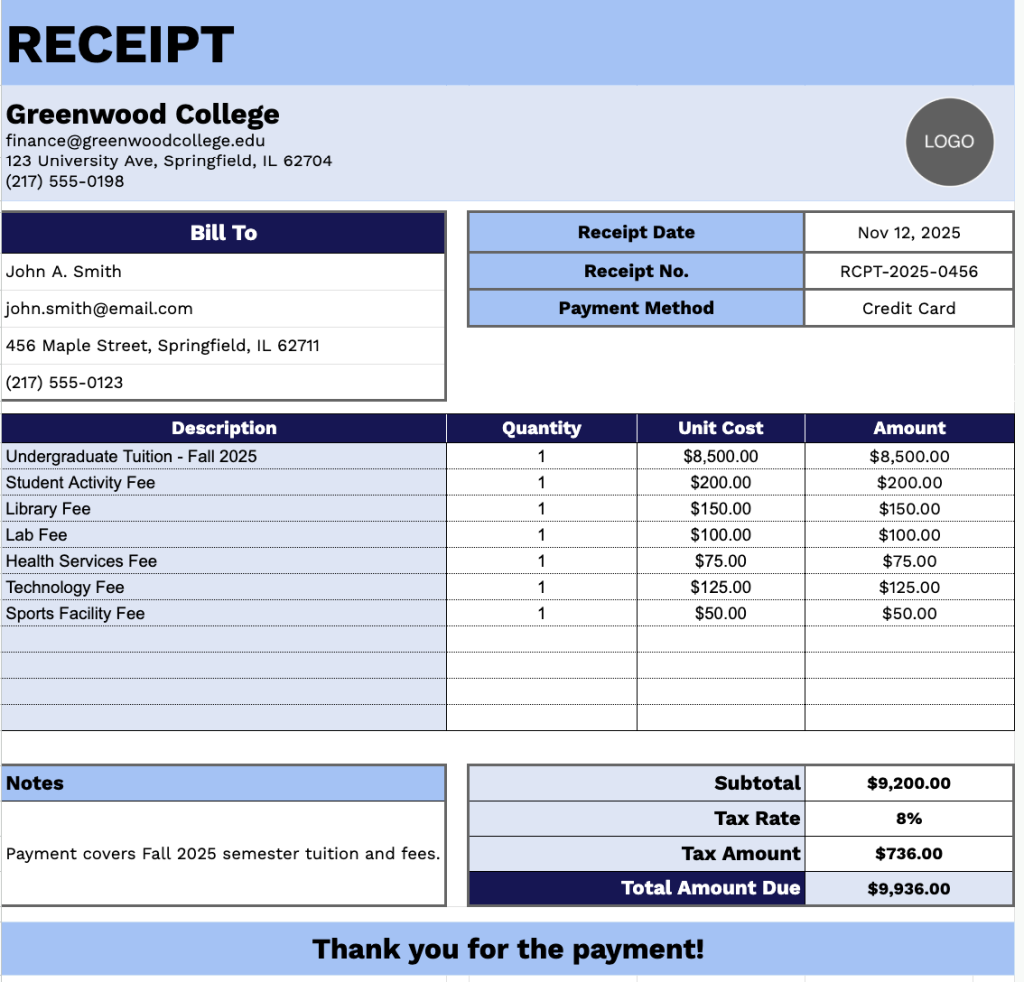 Looking for a college tuition receipt template, but don’t feel like creating one from scratch?