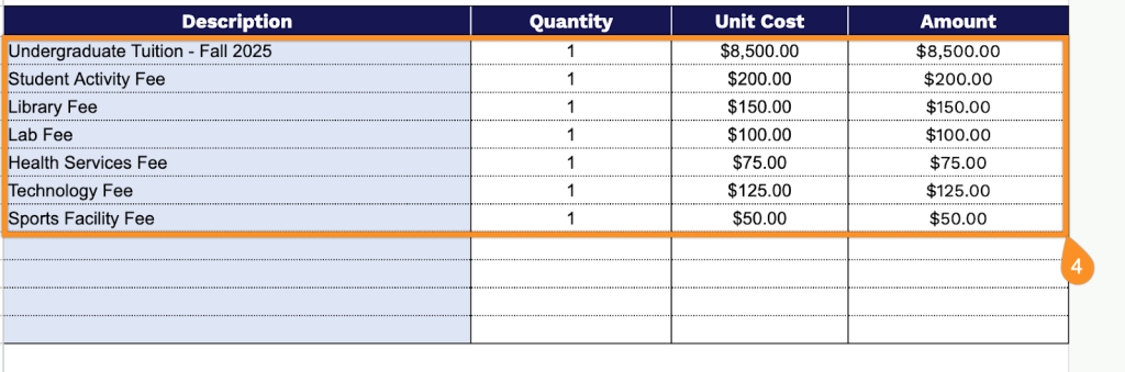 4. List the tuition and other fees. Include the quantity and price for each item. The template will automatically calculate the line totals.