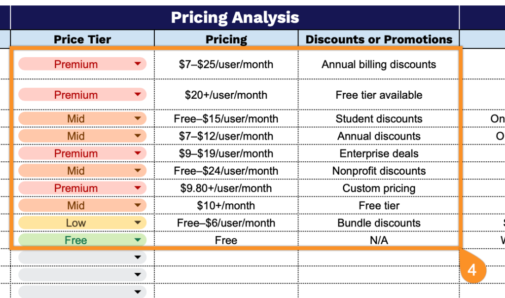 • Detailed pricing analysis fields: The template includes specific columns for tracking price tiers, base pricing structures, and competitors’ discounts and promotional strategies, providing clear visibility into competitive pricing dynamics and market positioning.