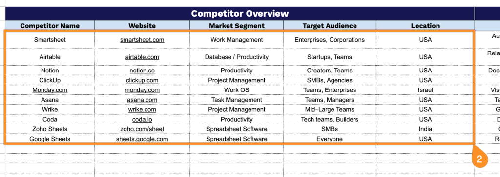 • Comprehensive competitor profile section: The template features dedicated columns for capturing essential competitor information, including company name, website URL, market segment classification, target audience demographics, and geographical location, enabling you to build a complete picture of each competitor’s market positioning and operational scope.