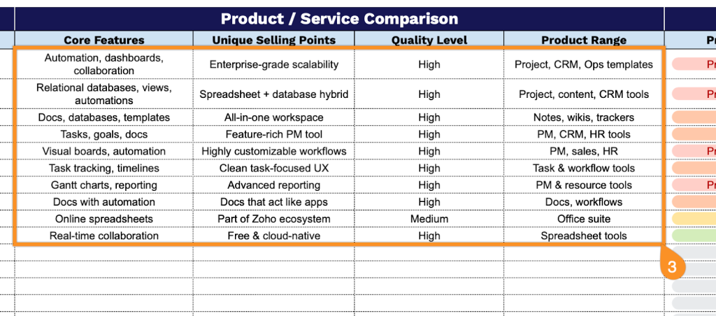 • Product and service comparison framework: Structured columns let you document and compare core features, unique selling points, quality assessments, and product breadth across multiple competitors, making it easy to identify competitive advantages and gaps in your own offerings.