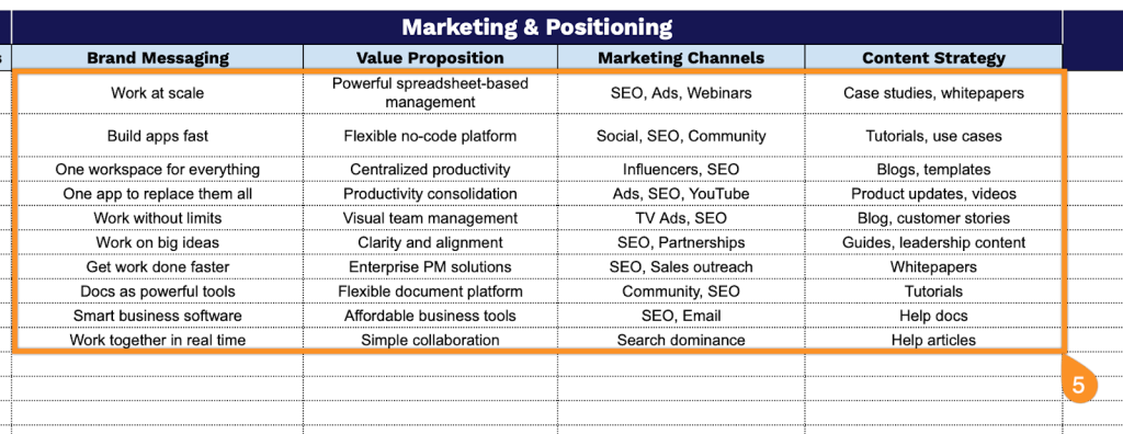 • Marketing and brand positioning tracker: Dedicated columns capture competitor brand messaging, value propositions, marketing channel usage, and content strategy approaches, allowing you to analyze how competitors communicate with their audiences and identify opportunities to differentiate your marketing efforts.