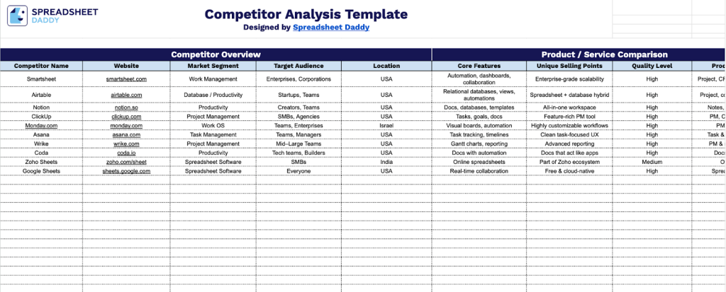 Download Spreadsheet Daddy’s Free Competitor Analysis Template