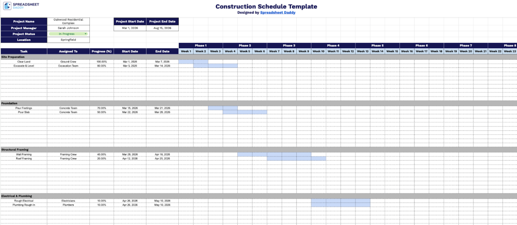 Our Construction Schedule Template provides a clear, visual overview of your project timeline, helping you track tasks, assigned team members, progress percentages, and key dates all in one place.