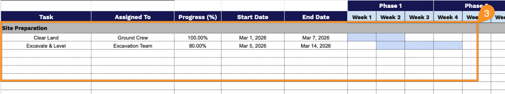 By using a template, construction teams can ensure all critical phases, from site preparation and foundation work to final inspections, are properly sequenced and completed on time.