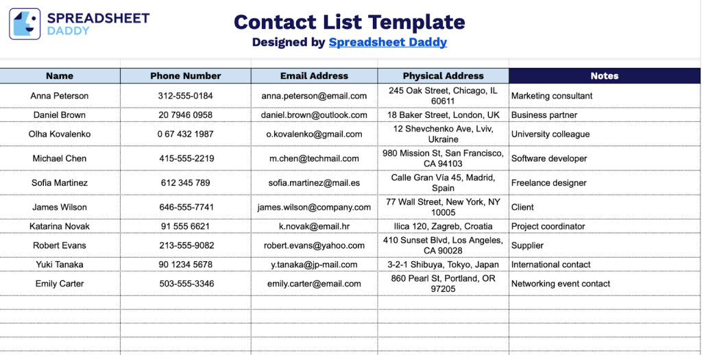 The template includes standard fields for names, phone numbers, emails, addresses, and notes, but you can easily customize it by adding or removing columns to fit your specific needs.