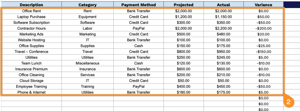 - Actual: Document the real amount spent once the expense has been incurred or the payment has been processed.