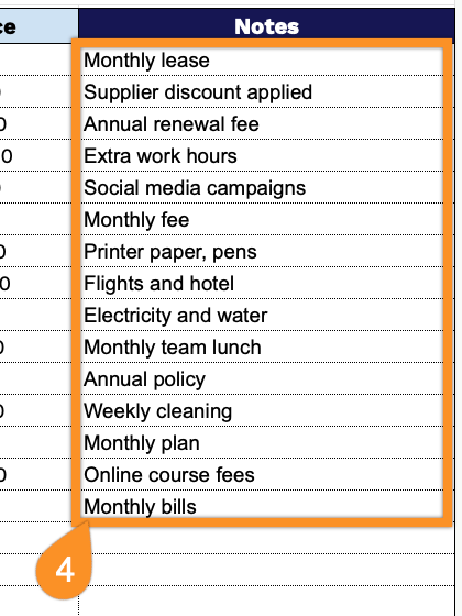 - Notes column for added context: The rightmost column provides a free-text Notes field on every row, giving you space to add vendor names, approval references, payment dates, or any other relevant details that provide context beyond the core cost figures.