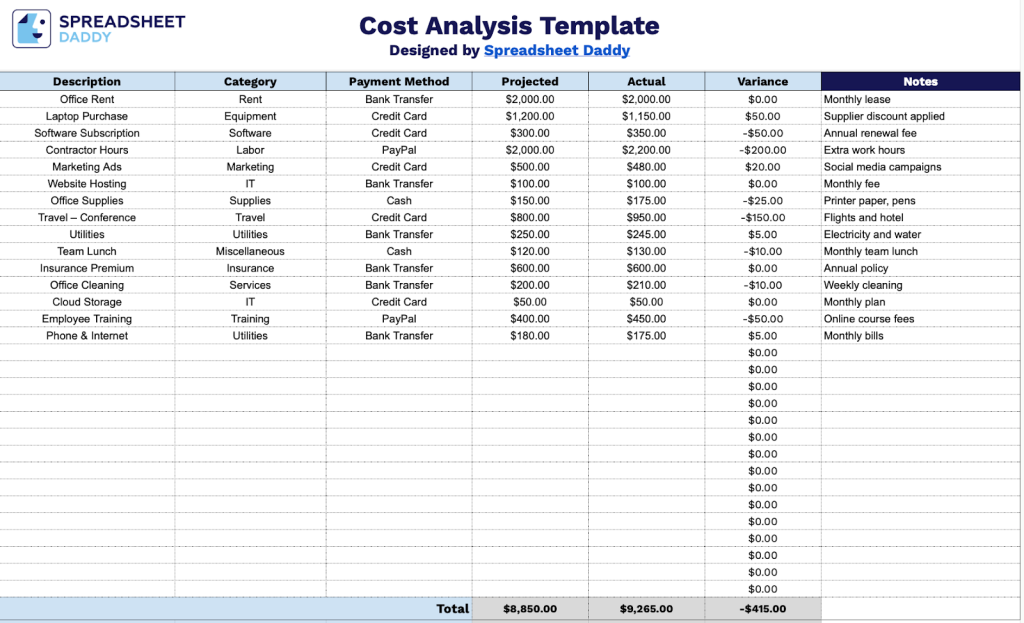 Download Spreadsheet Daddy’s Free Cost Analysis Template