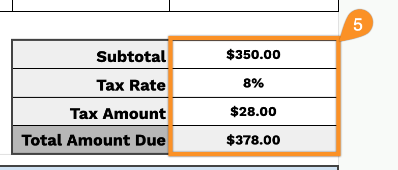 5. Apply the appropriate tax rate. The template will automatically calculate the subtotal, tax amount, and total amount due.