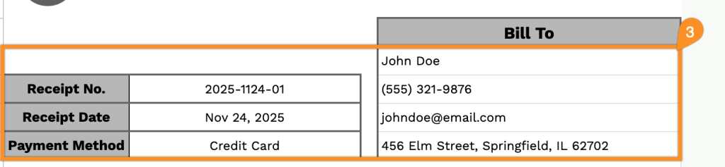 3. Complete the “Bill To” section with the recipient’s details, along with the receipt date, receipt number, and payment method.