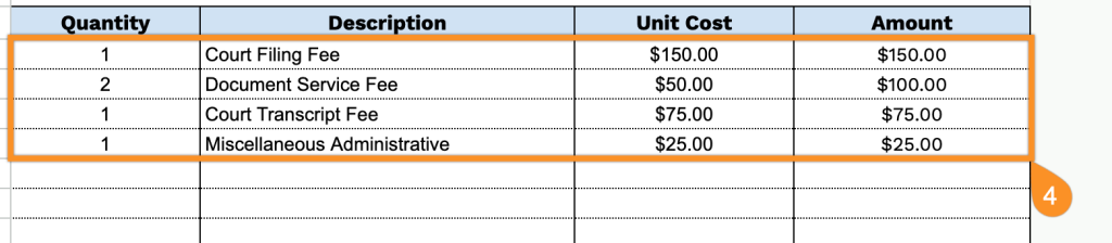 - Detailed itemized transaction table: A table with four organized columns (Quantity, Description, Unit Cost, and Amount) allows for comprehensive documentation of multiple court fees, filing charges, legal services, or administrative costs.