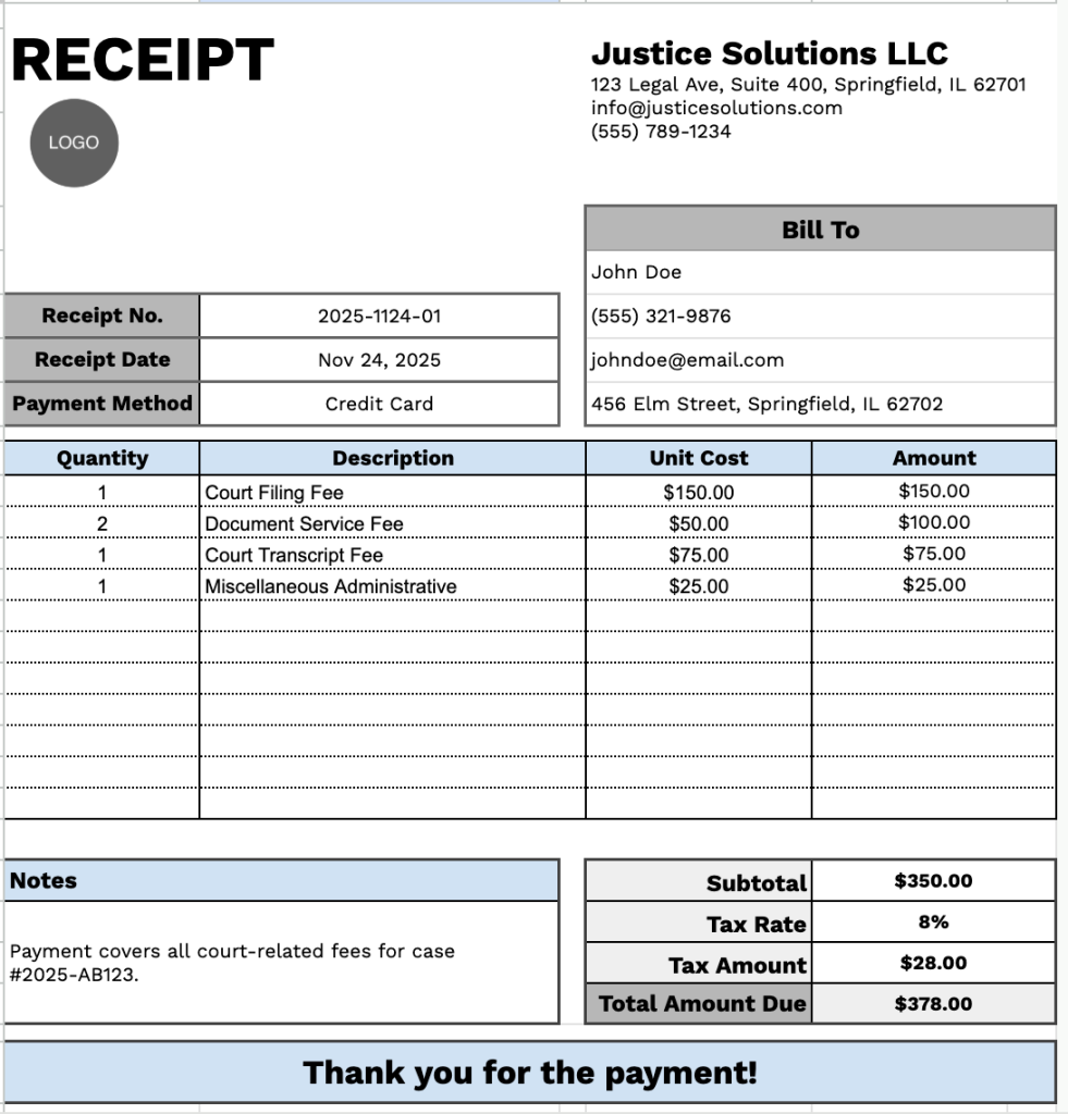 - Comprehensive company and billing details: Dedicated input fields capture essential information, including company name, address, email, phone number, customer name, billing address, contact information, receipt number, receipt date, and payment method, ensuring complete record-keeping for every court-related payment transaction.