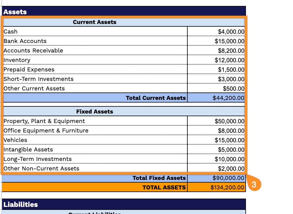• Comprehensive asset-tracking framework: Organized into Current Assets and Fixed Assets, each category features automatic subtotaling and rolls up to a total for complete visibility of company resources.