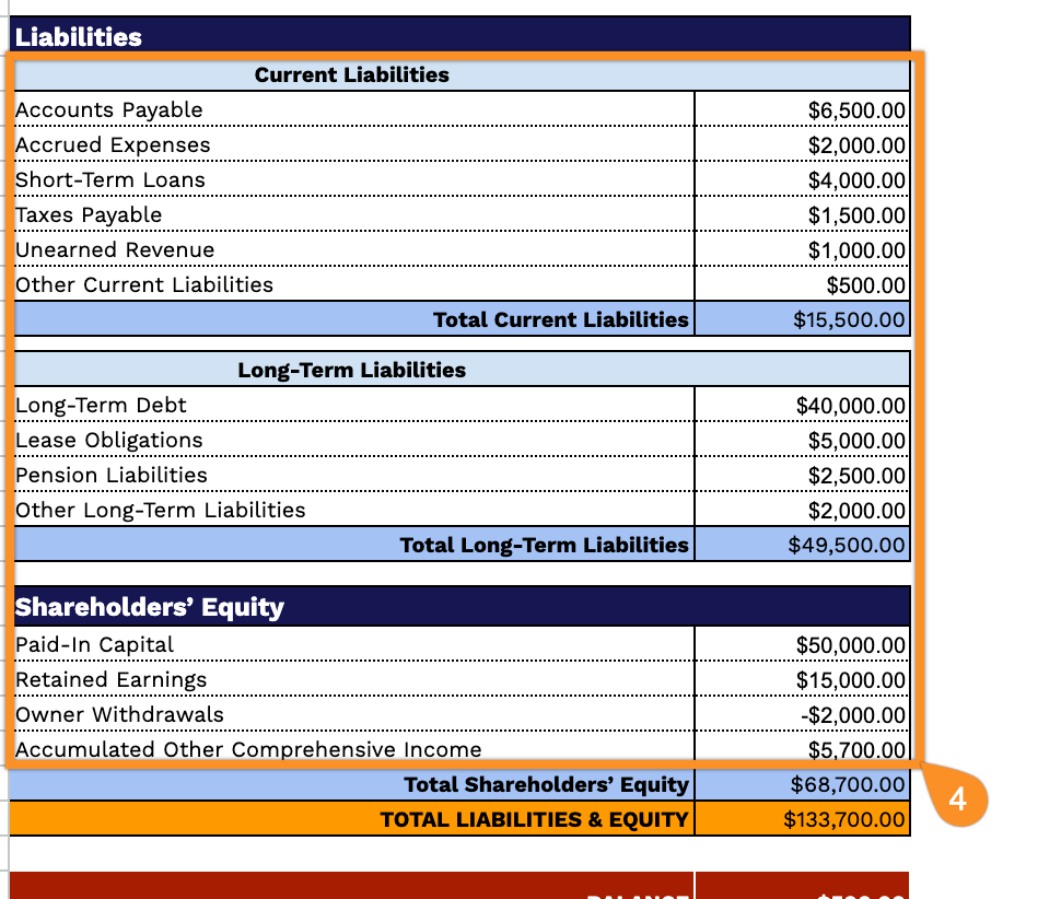 • Dual-tier liability structure: Separating Current Liabilities from Long-Term Liabilities, this classification helps distinguish immediate obligations from extended financial commitments and provides calculated subtotals for strategic cash flow planning.