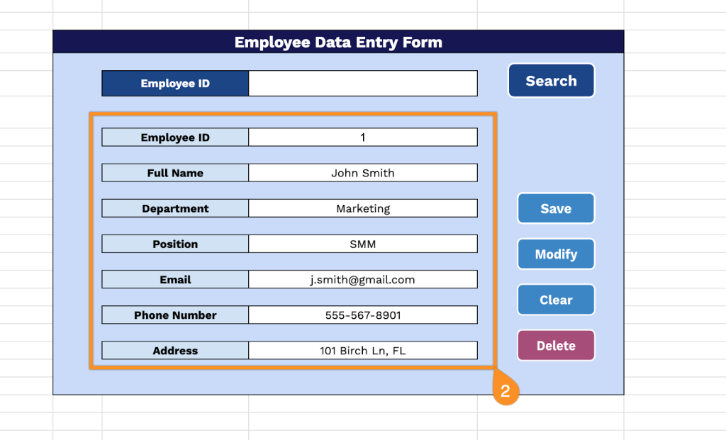 - Dedicated data entry form section: Clean input interface with seven labeled fields that allow for quick and systematic entry of individual employee records without cluttering the main database view.