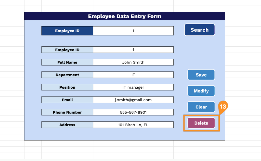 13. To delete an employee’s record, search for their information by entering their ID, then click Delete.