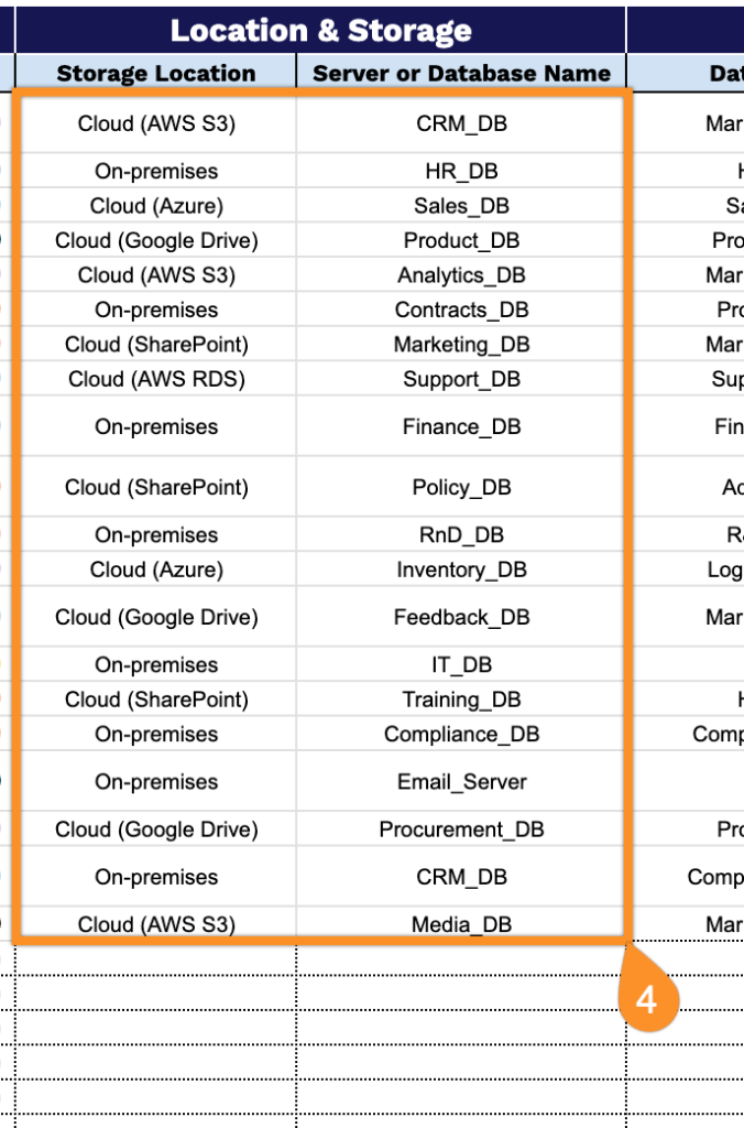 - Storage Location: Identify where the data resides (on-premises server, cloud platform, data center, or hybrid environment).