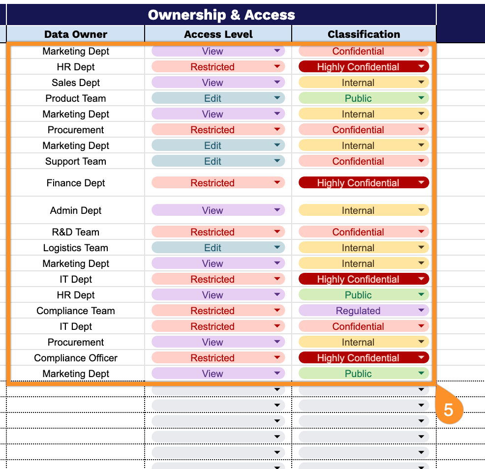 - Ownership & Access control framework: Establish clear accountability and security governance through three critical columns. The Data Owner designates the responsible party, the Access Level defines who can view or modify the data, and the Classification marks the sensitivity levels (public, internal, confidential, or restricted) for compliance purposes.