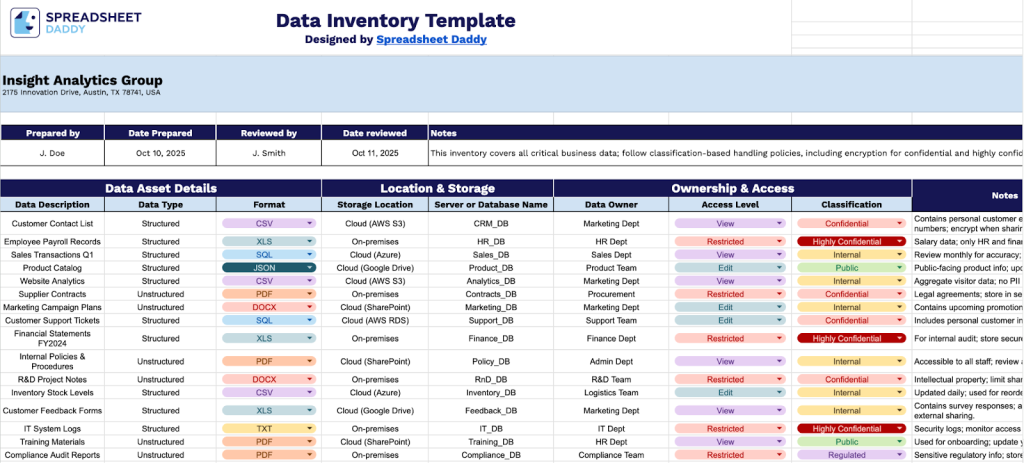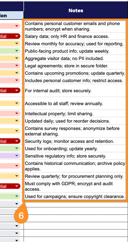 - Flexible Notes column for contextual information: Add supplementary details that don’t fit structured fields, including retention policies, compliance requirements (GDPR, HIPAA), data lineage notes, backup frequencies, or any special handling instructions needed for proper data management.