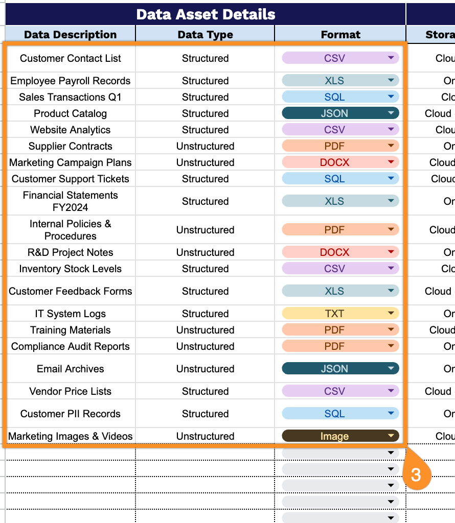 - Data Asset Details section: Document the core characteristics of each data asset through three structured columns. Data Description provides detailed explanations of what the data contains, Data Type categorizes information, and Format specifies file types or database schemas.