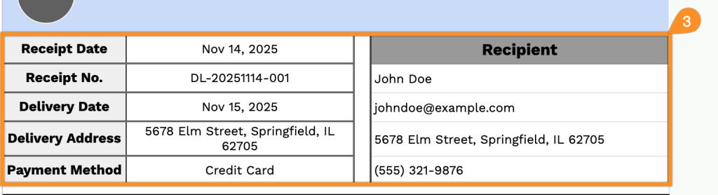 - Recipient information block: Dedicated fields for the recipient’s name, email, delivery address, phone number, and payment method capture all essential delivery and contact details in one organized section.