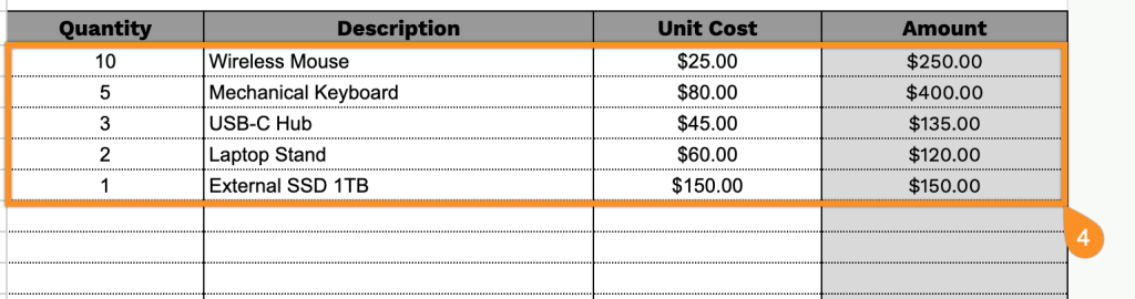 - Multi-row itemization table: A table with four structured columns (Quantity, Description, Unit Cost, Amount) enables you to list delivered items, products, services, or additional charges with a precise pricing breakdown for transparency and clarity.