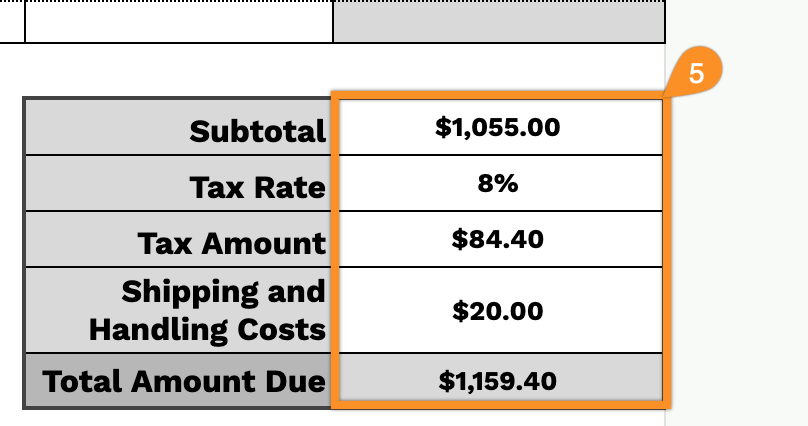 5. Include any applicable tax rate as well as shipping and handling fees. The template will automatically calculate the subtotal, tax, and total amount due.