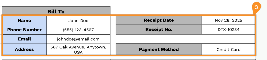 - Comprehensive customer billing section: The “Bill To” area captures essential customer information, including name, phone number, email, and physical address, along with receipt date, receipt number, and payment method fields to maintain complete transaction records.