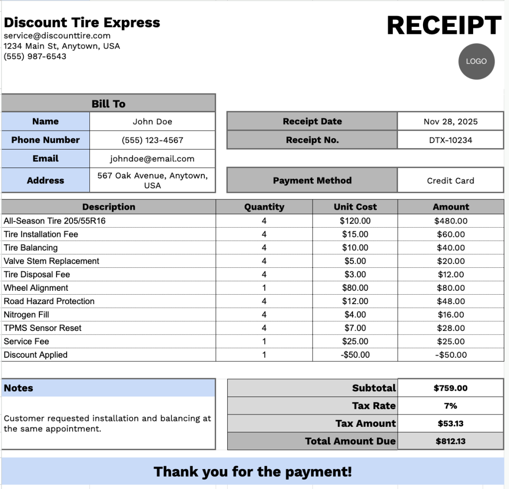 Our Discount Tire Receipt Template provides a clean, professional format for documenting tire services and purchases.