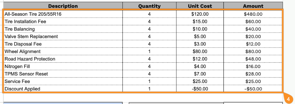 Grab our free, easy-to-edit template in Google Sheets, Excel, Word, Google Docs, and PDF. It’s designed to clearly document tire sales, alignments, repairs, and other automotive services.