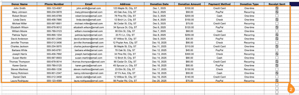 • Essential transaction-tracking columns: Each entry captures critical donation details through the Donation Date, Donation Amount, and Payment Method fields, providing a complete financial record that simplifies bookkeeping and tax reporting and helps you analyze giving patterns over time.