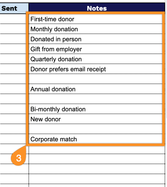 • Flexible notes and documentation field: The Notes column provides space to record crucial contextual information, such as campaign attribution, memorial or honorarium details, donor preferences, matching gift opportunities, or special instructions, enhancing personalization and improving donor stewardship.