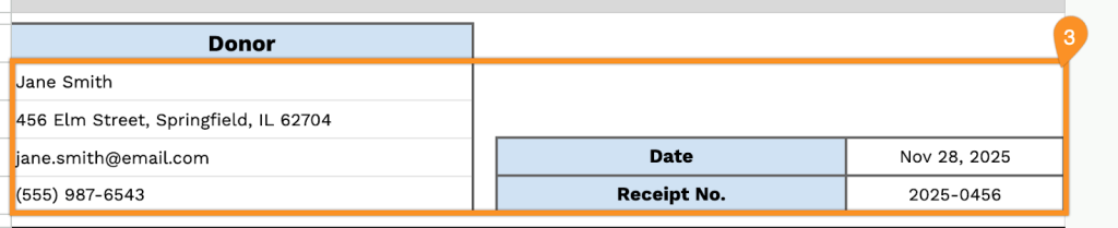 3. Add the donor’s name, contact information, the date of donation, and the receipt number.