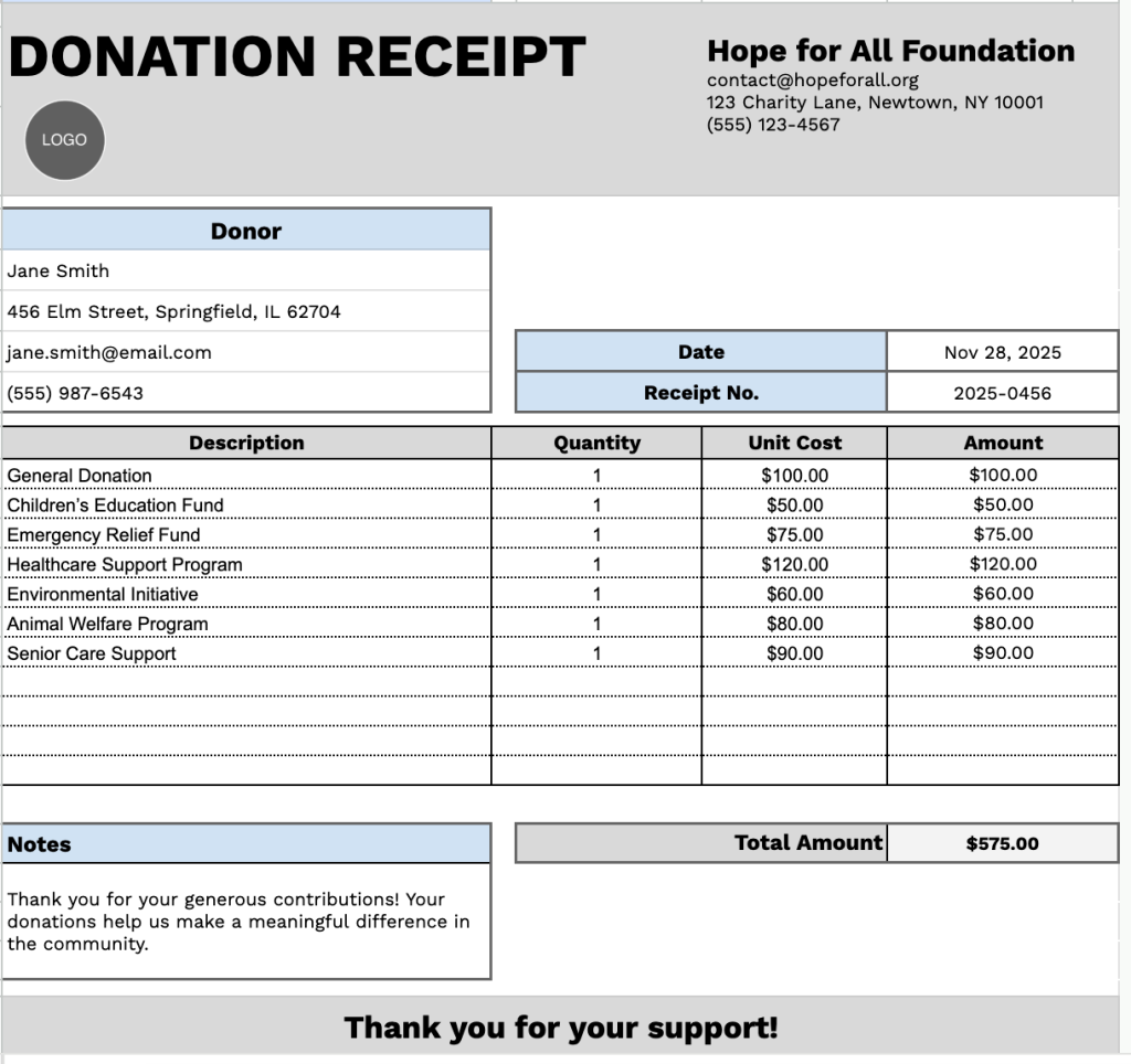 - Professional formatting with notes section: A clean, printer-friendly layout features well-spaced text and clear section headers, plus a dedicated Notes area for adding tax-deductible statements, IRS disclaimers, or personalized thank-you messages, concluding with a courteous “Thank you for your support!” acknowledgment.