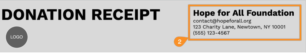 2. At the top of the template, include your charity’s name, email, address, phone number, and logo.