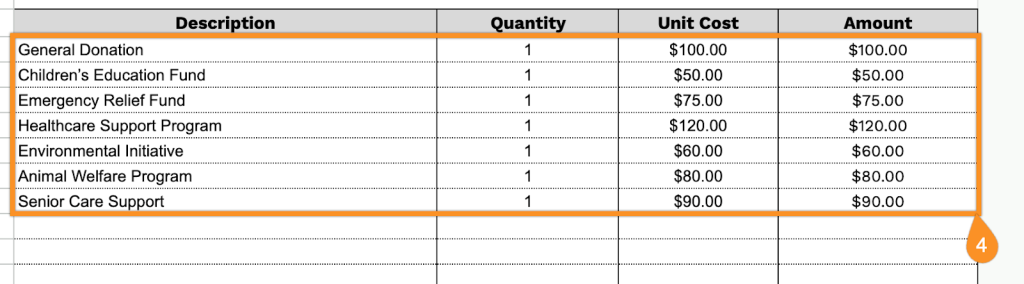 - Itemized donation tracking table: A table with columns for Description, Quantity, Unit Cost, and Amount enables detailed recording of multiple donations, whether cash contributions, in-kind gifts, or goods, with clear line-item breakdowns for accurate valuation and reporting.