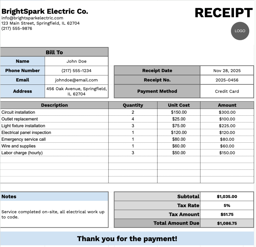 1. Download this electrician receipt template in Excel, Word, or PDF, or make a custom copy in Google Sheets or Docs.