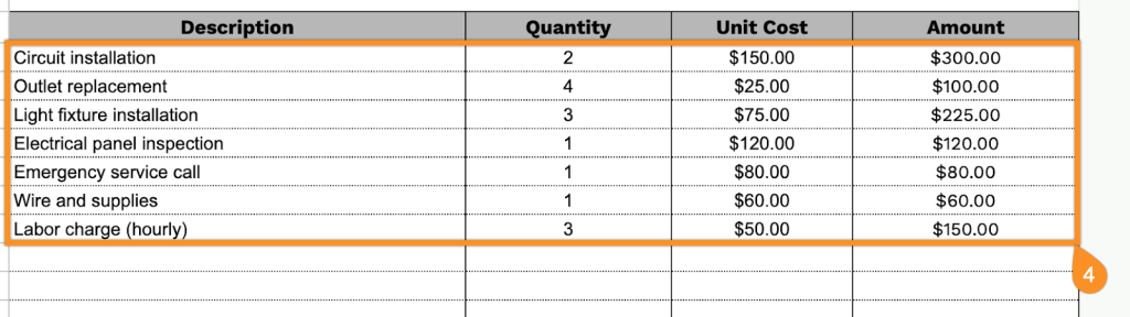 - Detailed line item table: Four-column structure (Description, Quantity, Unit Cost, Amount) with pre-formatted rows, allowing you to itemize multiple electrical services, labor hours, and materials with a clear pricing breakdown for each line item.