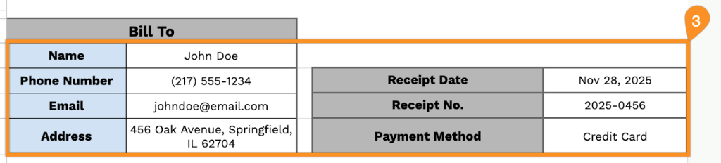 3. Complete the “Bill To” section with your customer’s name and contact info. Include the receipt date, receipt number, and payment method.