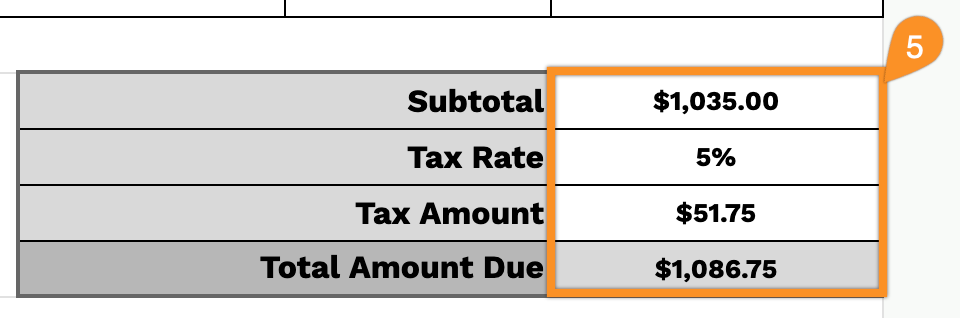 5. Add the applicable tax rate for your services or materials. The template will automatically calculate the subtotal, tax amount, and total due.